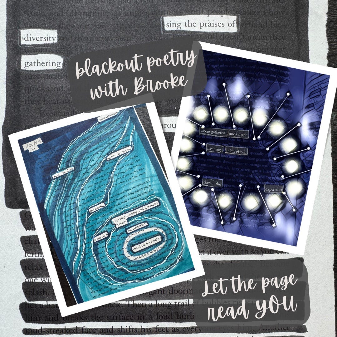 We gather online at from 12 - 1:30p CT on the first Friday of each month to practice blackout poetry and share our insights, questions, and reflections (if we choose). These practice groups are free for paid subscribers. You can join as a monthly or annual subscriber $30/yr or $5/mo. Paid subscribers receive the zoom link for the monthly group as well as images of book pages for the practice.